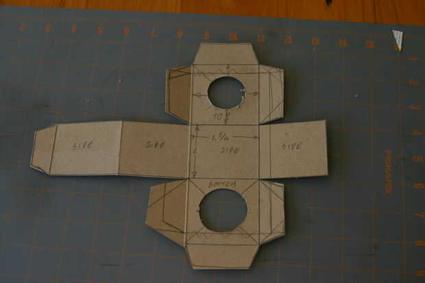 me parece que es mejor marcar los dobleces antes de cortar el patrón.  Corte los orificios para el micrófono en la parte superior e inferior.  Recuerde dejar las lengüetas para pegar la caja.