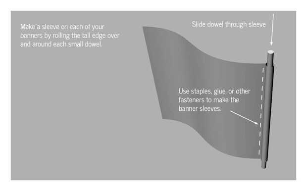 Colocar las banderas a los palos. Simplemente dobla un extremo de la bandera alrededor de la espiga delgada y utiliza grapas. También puedes utilizar pegamento, remaches, o coserlas en--lo que funcione.