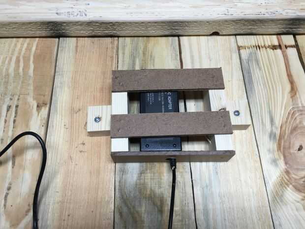 Ya que esto va a tener una tira de luces LED ir en la parte superior del marco de la construí una pequeña cesta para sostener el transformador para la luz y había conectado a la parte posterior con tornillos. Esto se puede mover dependiendo de la posición de la corriente eléctrica en la pared de montaje. Yo también muescas en la sección de 2 x 4 medios de la estructura para que el cable para el enchufe que no afecten a la bandera de sentarse al ras contra la pared. El cable colocado en la muesca y grabado sobre. También perforé dos agujeros de diámetro de 1/2 pulgada en la parte superior e inferior del marco, otra vez para permitir que el cable de alimentación LED poder conectarse a la tira de luz LED sin tener que ir a través de la parte posterior del marco. O más bien la parte de la estructura que va a tocar la pared. El objetivo aquí era ocultar todos los cables y los cables de alimentación así que una vez su instalación en la pared no será visible desde el frente.