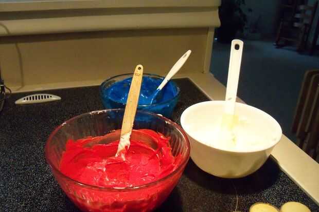 Se necesita: -envolturas de la Magdalena mini (60) -lata de hoja mini cupcake -azul hielo -rojo guinda -blanco hielo -estrellas de brillo comestible -mezcla de la torta