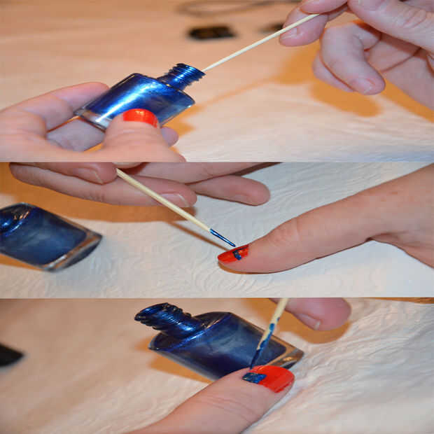 Luego puede tomar un palillo y ponerlo en el esmalte de uñas azul.