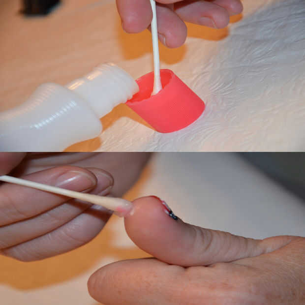 Los termine, usted puede tomar el quitaesmalte y algodón, luego el algodón en el líquido de la inmersión. Y por último, sólo el exceso de tinta alrededor de la uña.