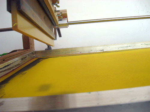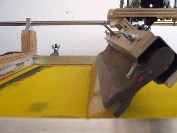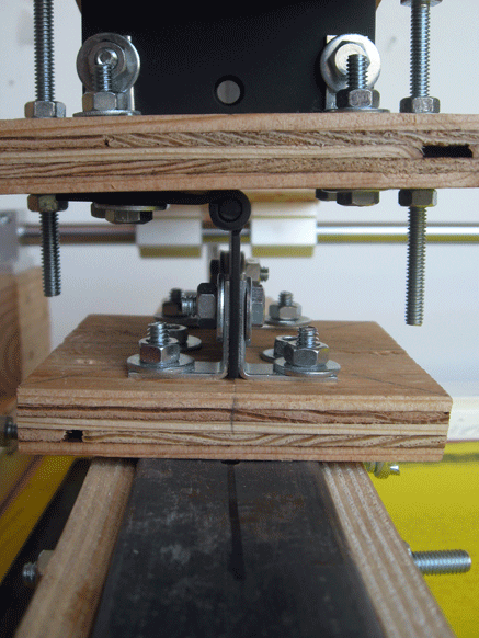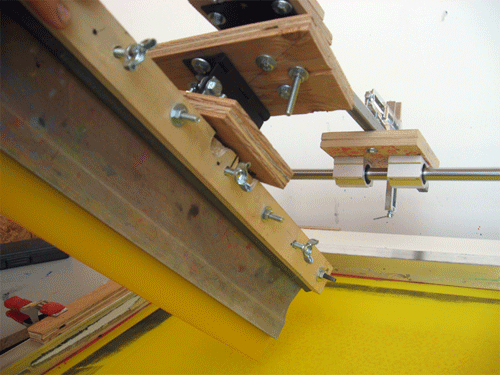 Así que ¿qué pasa con estos pernos limitador? Aquí es cómo funcionan: la placa adherida al canal del puntal golpea el extremo de la negrita así que me permita establecer el máximo juego en cualquier dirección. Con los pernos del limitador que se retractó el juego del ajuste de impresión/entintado es bastante grande. Por tener dos direcciones de movimiento, la escobilla de goma puede "fijarse" paralelo a la superficie de impresión, incluso si la superficie de impresión no es paralela con la escobilla de goma colgantes (como el mío).