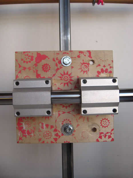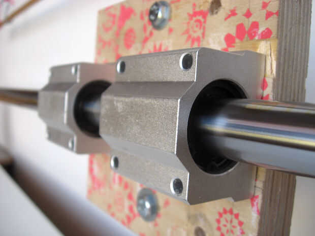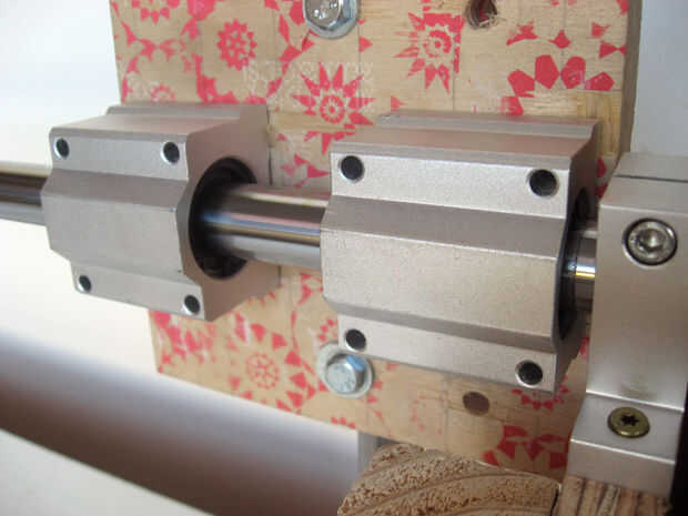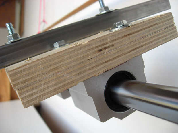 Con el eje montado es hora de ocuparse de los trineos de cojinete. Os adjunto los trineos a dos capas de chatarra contrachapado de abedul de 1/2" con tornillos. Los cuatro orificios en cada trineo están roscados por lo que no necesitaba a los pernos a través de todo el camino: el perno de agarra a los hilos y tira los ejes ajustados con la madera contrachapada.