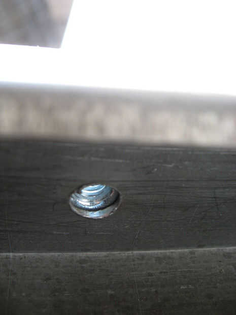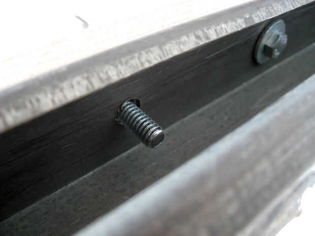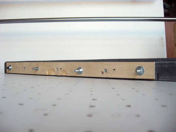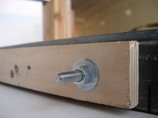 Entre los cuatro pernos en la tercera foto son tres tuercas en t. Estas tuercas en t son empujadas a través de la parte posterior de la madera contrachapada y roscas para tres tornillos de sujeción. Más adelante veremos cómo estos pernos sostenga la boquilla en su lugar.