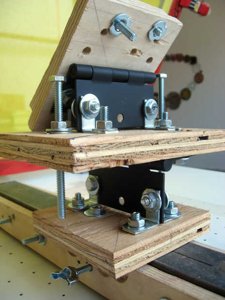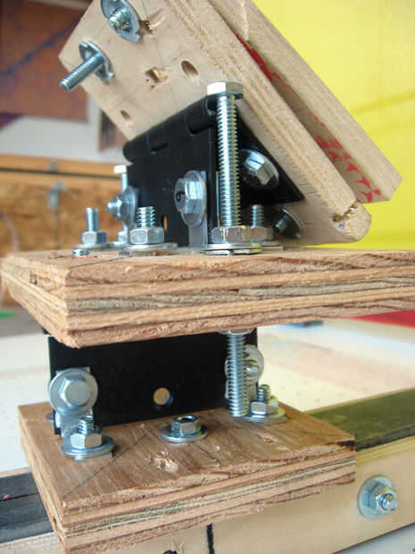 Tomé tres trozos más de madera contrachapada, marcado sus centros, adjuntos dos conjuntos de 3 1/2 pulgada puerta las bisagras en ángulo de 90 grados uno del otro y todo esto bien atornillados. También he añadido los pernos del limitador (más sobre estos pernos en tres pasos).
