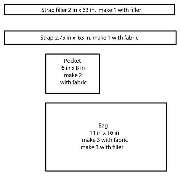 - Con su tela cut1 pieza 2,75 pulg x 63 pulg (para la correa), 2 piezas 6 pulg x 8 pulg (para el bolsillo) y 3 piezas de 11 x 16,5 pulgadas (para el frente, parte posterior y solapa).