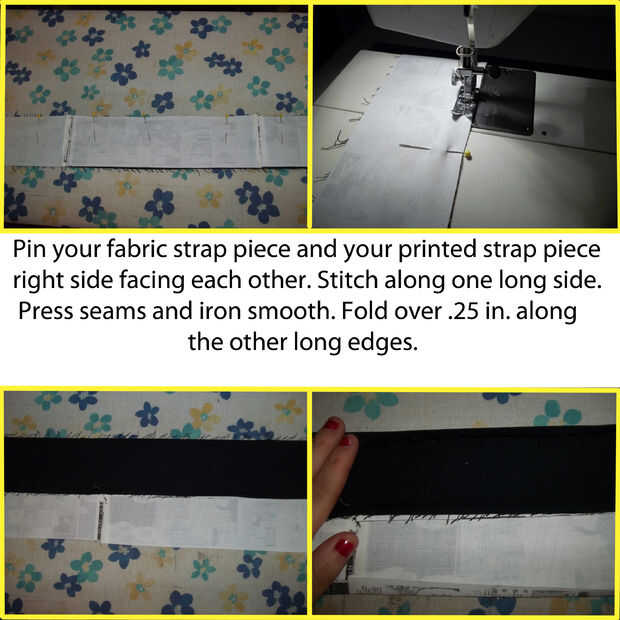 6. prender la pieza de la correa de la tela y la pieza impresa Correa derecha uno frente al otro. Coser el lado largo. Pulse las costuras y el hierro suave. Doble más.25 pulg. a lo largo de los otros bordes largos.