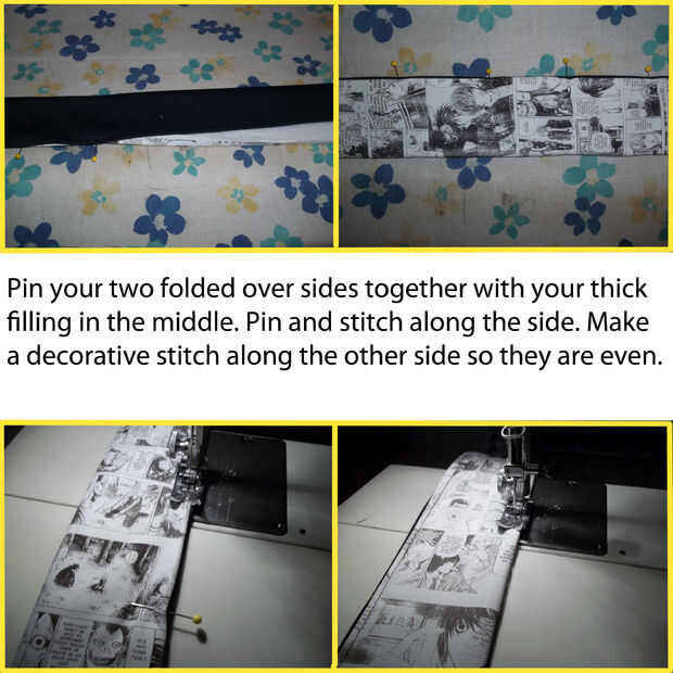 7. pin su dos doblado sobre lados junto con su interfaz en el centro. PIN y coser a lo largo de la cara. Hacer una puntada a lo largo del otro lado por lo que son.