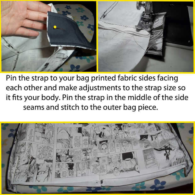 1. Pasador de la correa a tu bolsa impresa caras de tela uno frente al otro y hacer ajustes en el tamaño de la correa para que quede su cuerpo. (Que tendrás que recortar unos poquitos si es pequeño) Pasador de la correa en medio de las costuras laterales y coser a la pieza de la bolsa exterior.