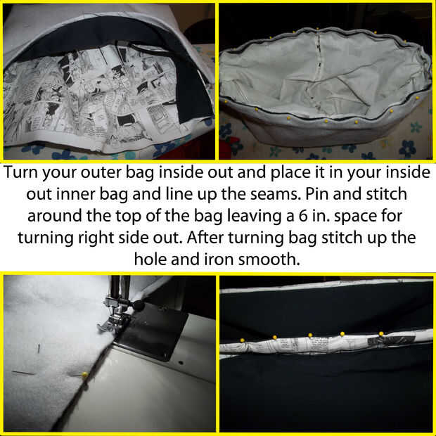 2. Vuelva su bolsa externa y colóquelo en la bolsa de adentro hacia fuera interior y alinee las costuras. (encarando los derechos mutuamente) PIN y coser en la parte superior de la bolsa dejando un espacio de 6 pulgadas para dar vuelta de lado derecho hacia fuera (costura hacia atrás al principio y al final para reforzar). Después de dar vuelta la bolsa coser el agujero y el hierro suave.