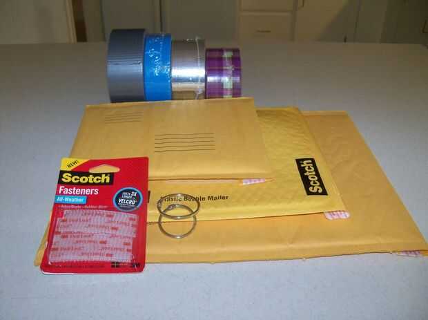 -vario tamaño sobres postales con burbujas (estos serán los bolsillos así que tantos o tan pocos como usted tiene gusto) -cinta adhesiva (este wil reforzar los bolsillos, sino que también permite expresarse a través de qué eliges) -doble la cinta echada a un lado -cinta aislante -2 + llaveros -una correa de