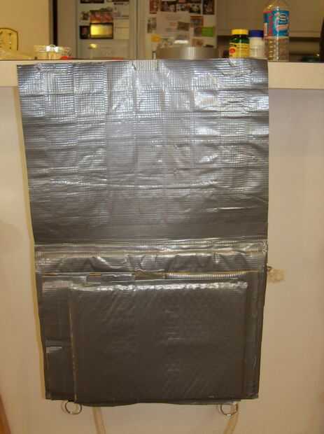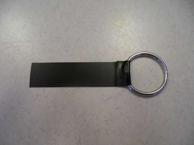Corte a en 3 pedazo de cinta aislante y la picadura a través de la clave del anillo como se muestra a continuación. Repetir este proceso con el otro aro. Una vez que ha hecho cinta ellos en lados opuestos. Ahora vamos a hacer la aleta colocando tiras de lado pegajoso de la cinta del conducto a lado pegajoso, y grabar en la parte posterior de la bolsa.