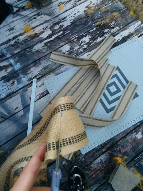 Si utiliza fleje de tapicería o alguna otra tela que ya está cortada a la anchura, medir longitudes para aproximadamente coincidir con las piezas de piel. Si está utilizando yute, desea trabajar con unas tijeras afiladas! Si no utiliza a fleje o de otro tejido que ya está cortada a la anchura, medida, marca y correa delantera tela cortar en pedazos de 3 1/2 por 36 pulgadas.