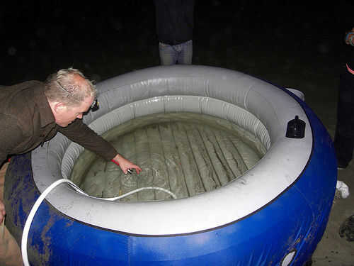Así comenzó una saga de polipastos cubo. Seis de nosotros tardamos unas horas a joroba de 200-300 galones en la playa a nuestra bañera de hidromasaje. Utilizamos grandes cubos, enfriadores, etc..