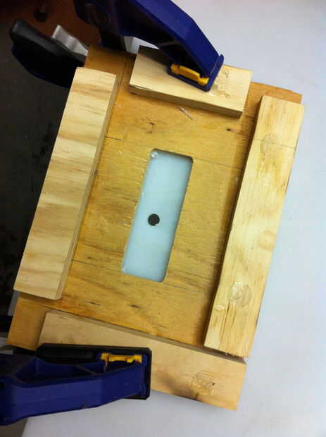 Los orificios del mango miden 1 1/2 "x 4 1/2" y la hice usando esta plantilla y un router de mano. La distancia desde el borde de mi 1/4" bits al borde de la mesa de fresar era 1 3/4". Después de marcar las dimensiones del agujero, hice otra serie de marcas de 1 3/4" fuera de los bordes del agujero. A lo largo de estas marcas he pegado algunos bloques que actúan como guías para la base de la fresadora y permite agujeros uniforme con bordes limpios para hacer.