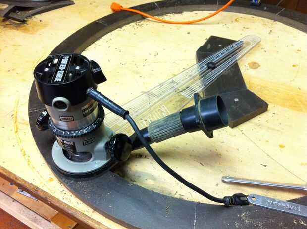 usé una plantilla de círculo en mi router para cortar el carril de cerdo.  Una plantilla de círculo le permite ajustar el radio del círculo a cualquier longitud deseada y gire la buriladora alrededor del punto de centro para cortar un círculo.  Se trata de una plantilla que compré pero usted puede hacer su propio enrutador a un tablero de montaje y luego perforando un agujero la distancia correcta de la broca.  Corte el círculo exterior primero y probado para asegurarse de que encajaría dentro de la bañera.  Una vez tuve el diámetro externo del tamaño adecuado que corte el círculo.  Recuerde que al fresar el borde exterior para ir hacia la izquierda y cuando encaminamiento el círculo para ir hacia la derecha para evitar que la broca de acaparamiento de la madera y salir corriendo!