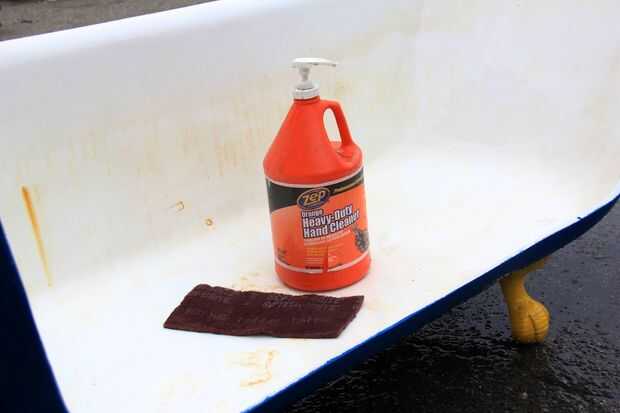 Tomar la bañera fuera y utilice un cojín abrasivo y limpiador abrasivo para limpiar el interior de la bañera. Yo no tenía limpiadores comunes y domésticos alrededor como cometa, así que usé Zep Hand Cleaner desde el baño de la tienda en su lugar - funcionaba muy bien.