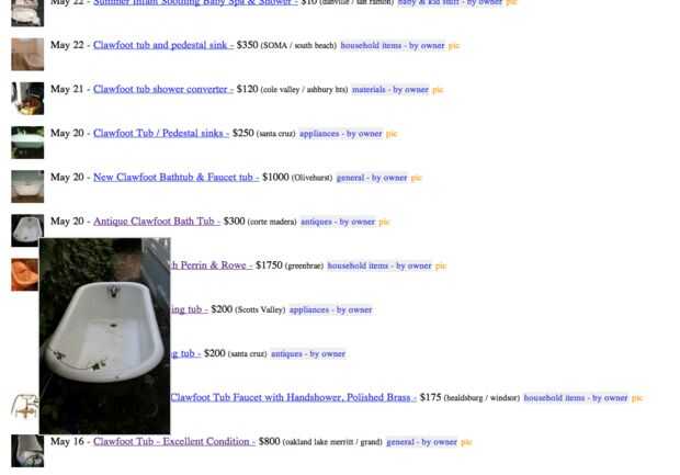 Busqué en Craigslist pocos días antes de ponerse en contacto con cualquier vendedor para conseguir una sensación para el mercado. Valió la pena la espera porque tengo mi bañera para $150 con entrega gratuita adecuada a mi tienda! En caso de que no sabes, es un buen precio para una bañera de pie de garra.