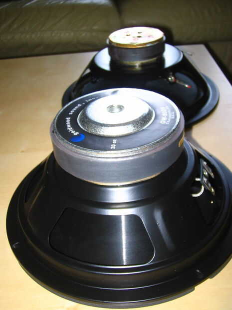Endecha altavoz en él está de vuelta. Utilice a un phillips para quitar los 6 tornillos que sujetan la cara entera altavoz plástico sobre el gabinete. Separado. Mentira de la cubierta de plástico negro en el suelo, con los altavoces mirando hacia abajo. Cortar los cables para tu woofer, lo más cerca al woofer como sea posible. Quite los 4 tornillos de phillips que sujetan las abrazaderas en el woofer. Ahora, compare su viejo woofer a su dulce nueva!