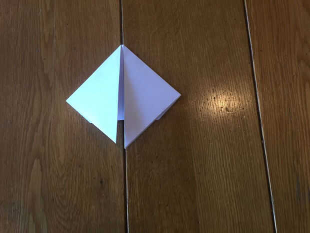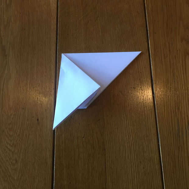 Dos dobleces más y terminamos. Lo que queremos hacer es doblar la esquina del ángulo superior derecho para que la parte superior ahora corre verticalmente en línea con el doblez del centro. Voltee el papel y coincida con el doblez anterior.