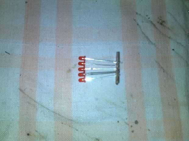 1. Corte el Protoboard para obtener un rectángulo de 5mmx15mm. 2. Coloque los cinco leds en una fila (como en la imagen) y les de la soldadura. 3. Suelde un cable hacia el ánodo de cada led