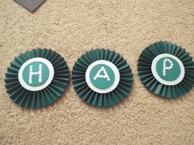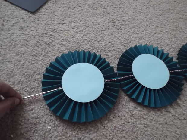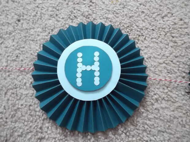 Cortar círculos más pequeño que el anterior, véase el cuadro. Luego dibujar las letras de feliz cumpleaños en cada círculo con el lápiz y pegar las fichas de papel, de acuerdo con las letras. Fanally corte la cuerda al tamaño del banner y unir todas las piezas de arte con el uso de grandes agujas de la parte trasera ver el cuadro para la idea.