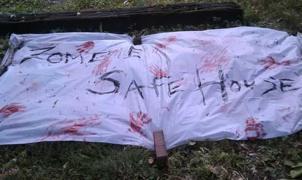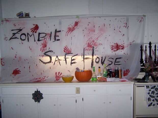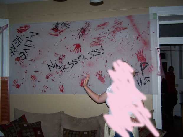 muy simple, muy barato! Es solo un paño de tabla plástico llano. Lanzó en unos guantes de goma y aerosol pintado mi palma blanca, luego arrastró sobre el paño de tabla. Si mucho del aerosol en su palma y flick en el paño de tabla, parece que salpicaduras de sangre. Hice tres de ellos, tomó unos 20 minutos, fue un montón de diversión y era una forma sin problemas para realmente cambiar la apariencia entera de nuestro hogar para halloween.