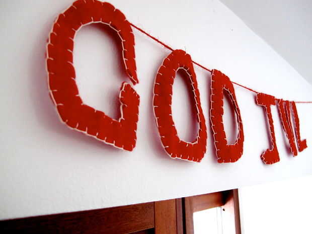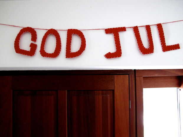 Después de crear una plantilla de papel usé fieltro Nepal hecho a mano extra piensa recortar las letras. Luego usé una puntada manta para ir alrededor de los bordes. Finalmente había cosido a una cuerda roja y había colgado sobre la puerta.