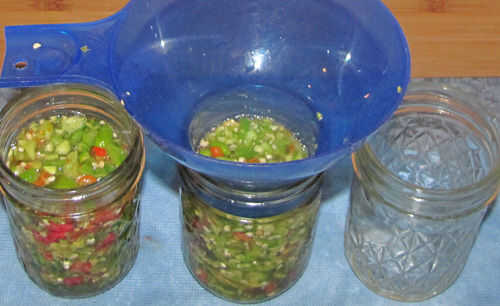 Una vez listo, sacar los frascos del baño de agua caliente utilizando los "elevadores de tarro" y usando el "embudo de Canning de boca amplia", llene cada uno de los frascos con su contenido de elección (asegurándose de dejar al menos 1/2" de espacio de cabeza).