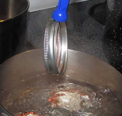 Limpie cualquier derrame o exceso del borde de los frascos (para asegurar un buen sello). Entonces usando el "levantador de tapa magnético" quitar las tapas y anillos del agua hirviendo y se aplican a la jarra. Finalmente, apriete hasta que queden bien.