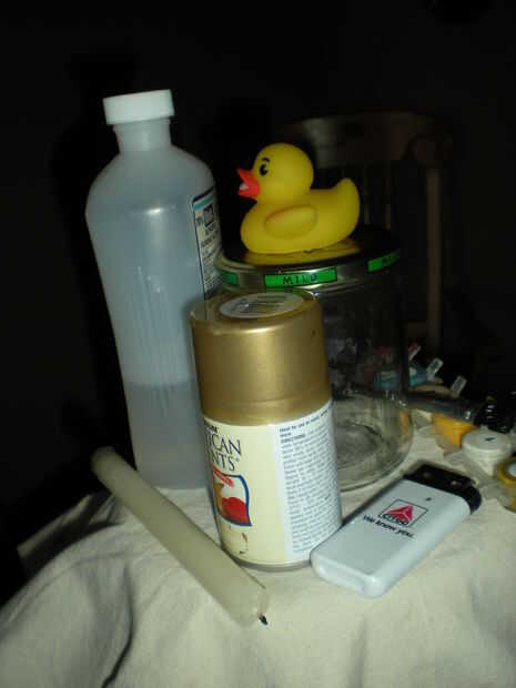 tarro de cristal de tamaño medio con una abertura grande (yo usé un bote de salsa) pintura azul y oro, agua, alcohol para fricciones, pato de goma pequeñas de jabón (no mostrar) de líquido de la mano.
