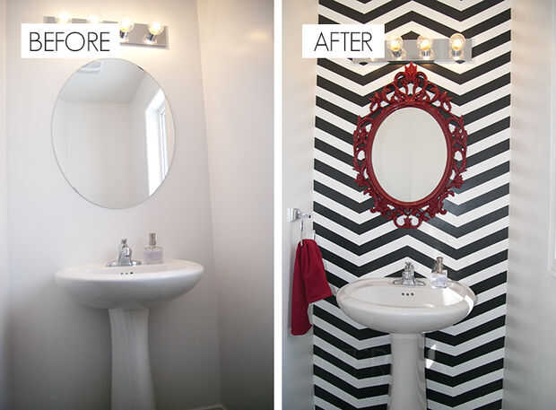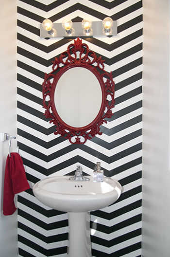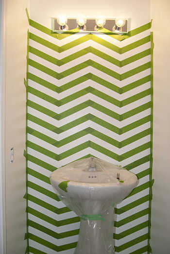 Para la pared de chevron utiliza cinta de pintor forrado hasta puntos cuidadosamente medidos para hacer nuestro patrón y pintado a la izquierda de las secciones por la cinta en negro.