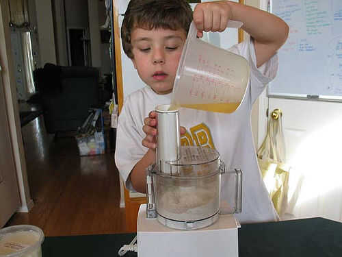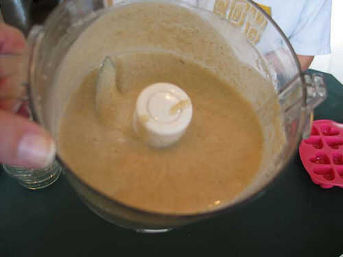 Añadir los aceites derretidos poco a poco a los ingredientes secos. Su "mezcla" debe ser un poco rígida. (Estaba húmeda y soleada en mi cocina y mina se ve líquido-y un poco, pero es una receta realmente indulgente, así que no se asuste si su mezcla es más líquida que piensas debe ser).