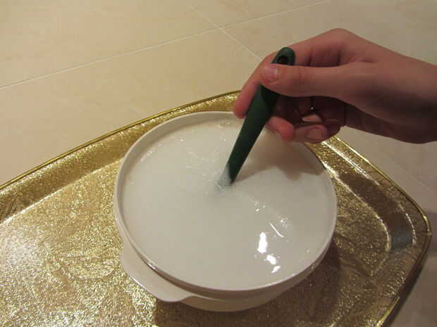 En un tazón grande mezcle 2 tazas de champú blanco, 3 tazas de agua y 2 cucharaditas de sal. Revolver hasta que espese.