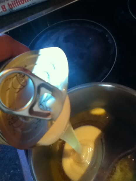 Añadir la lata de leche condensada. Mantener revolviendo. No dejar de revolver. Quizás usted prefiera usar un bate con, o una cuchara de madera.