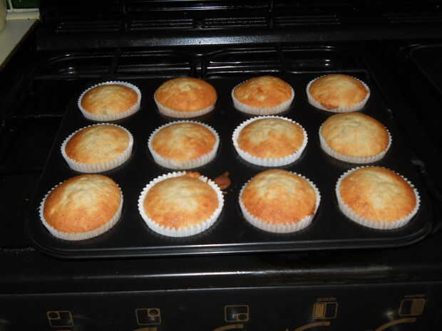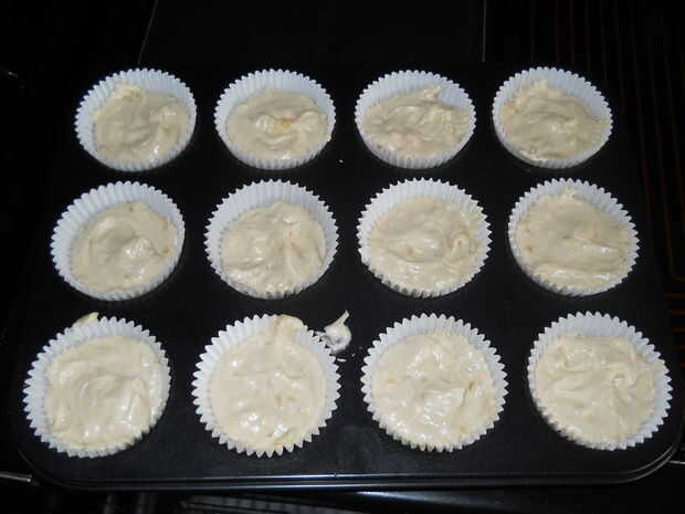 Repartir uniformemente la mezcla en los casos de la Magdalena, hasta que cada uno es 2/3 completo. Hornear durante 20 minutos o hasta que un palillo insertado en el centro salga limpio. Dejar enfriar en la bandeja durante unos 10 minutos luego pasar a una rejilla para enfriar completamente.
