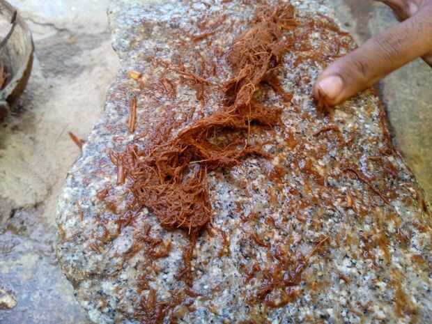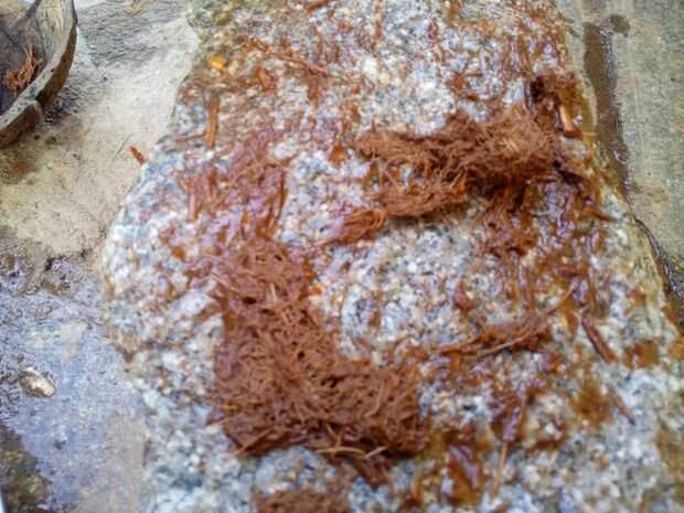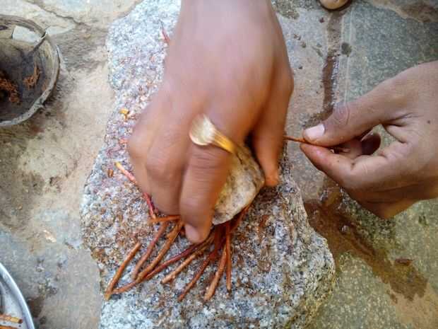 empezar a frotar las hojas que obtener aplastados entre dos piedras. Tienes que poner unas gotas de agua entre el procedimiento de pulido. A obtener una pasta color marrón en el extremo,