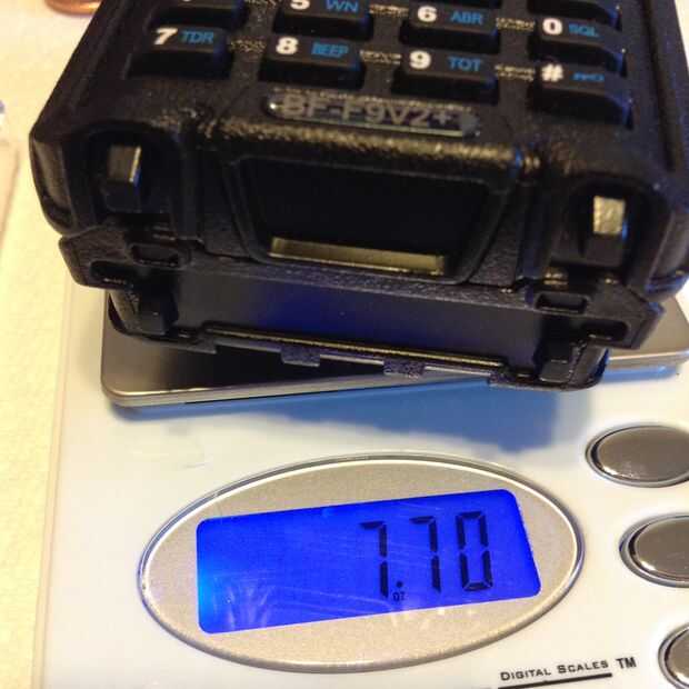 Para la diversión pongo la radio en la escala para ver cómo apila para arriba de peso así. El Baofeng FB-F9 V2 + pesa 7,7 oz cortina 1/4 de libra. Con la batería más grande probablemente estará más cerca de 1/2 libra.