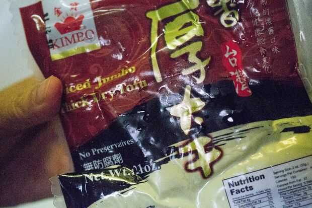 - tofu seco sazonado (queso de soja seco es vacío lleno y muy firme en comparación con el tofu silken/bloque. Consulte a esta guía del queso de soja)