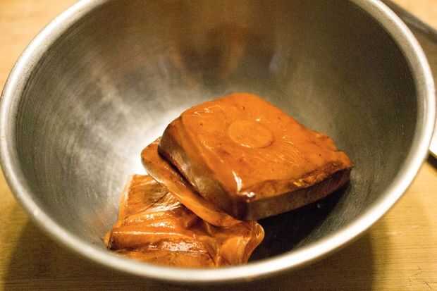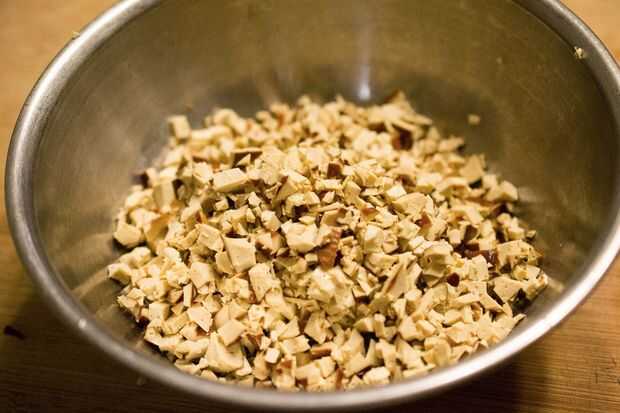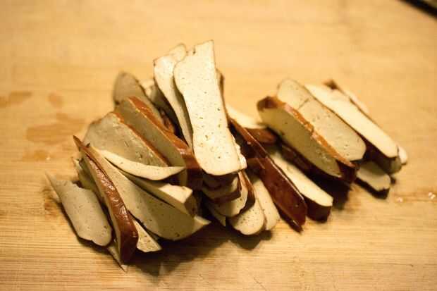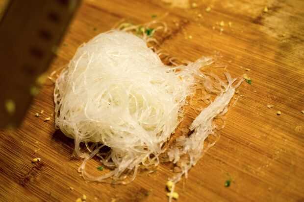 • Dados seco tofu, jengibre, cebolla, col, huevos e hilo de frijol hasta muy fino.