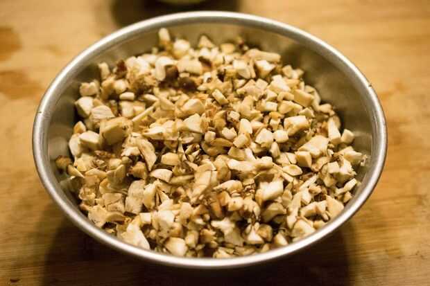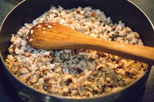 • Trocear los champiñones y cocinar con un poco de aceite en baja hasta que estén tiernos.