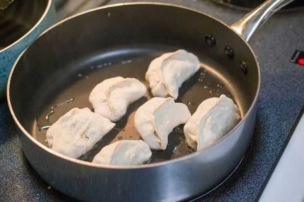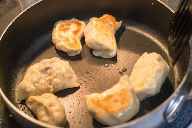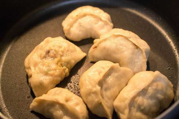 Calentar aceite en una sartén en medio, luego agregue las bolas de masa hervida. Añadir 1-2 cucharadas de agua y cubrir inmediatamente con una tapa. Bajar el calor a bajo. Vapor/fría durante 5-10 minutos hasta que toda el agua haya desaparecido. Después de que el agua se evapora, puede comprobar la parte inferior de la jiaozi. Desea que sean doradas. Es muy importante freír a fuego lento.