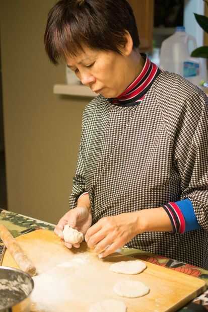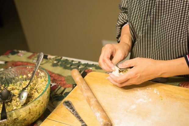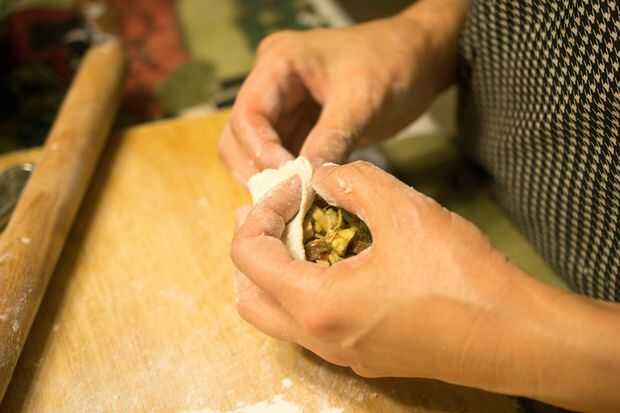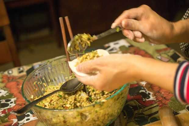 Para rellenar las bolas de masa hervida, cada piel de jiaozi y añadir una cucharada de relleno en el centro. Pellizque la parte superior de los dos lados juntos. Luego, tomar los lados y traerlos, haciendo un pequeño pliegue en cada lado.