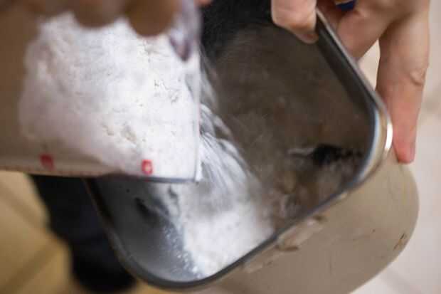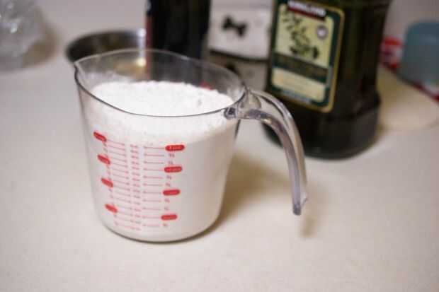 • Medir 4 tazas de harina, luego la mezcla en la mezcla de levadura. Puede utilizar el ciclo de masa en una máquina de pan, una batidora o a mano. Desea que la masa de rebote cuando presionado. Debe ser suave, pero no demasiado pegajosa.