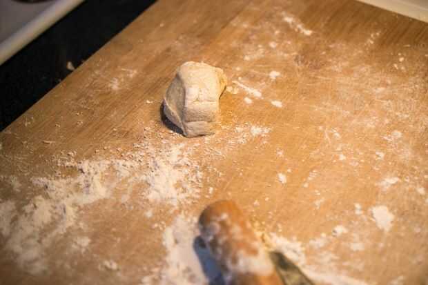 • sobre una superficie enharinada, enrolle la masa en una serpiente ~1.5-2 "diámetro. corte secciones de 1 pulgada