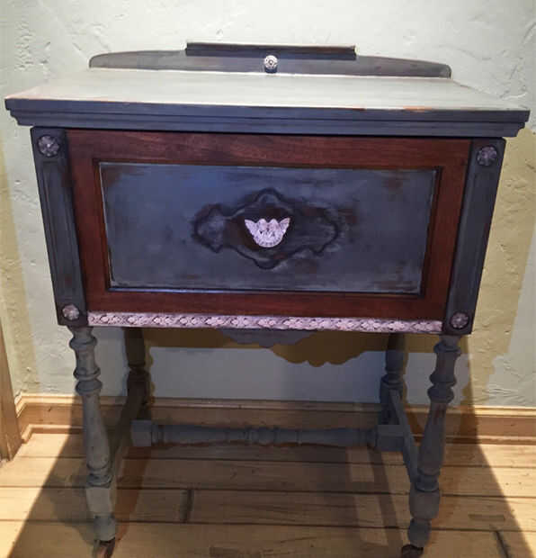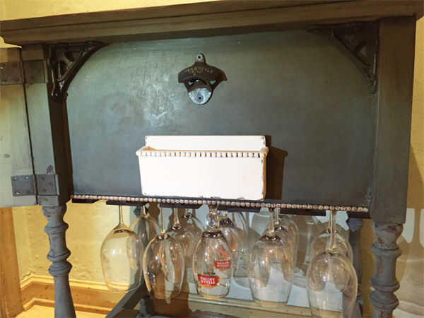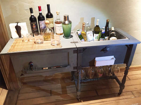 Mi esposa pinta el nuevo carro de servicio con una combinación de leche pintura y pintura de tiza y alguna mancha de madera de barra. Adjunto las bisagras de la tapa y cayó el hielo en el lugar. Mi esposa sujeta un abrelatas de botella y botella casquillo receptor (construido en un cuadro más grande que se encontró en el interior del soporte original de costura) en la plataforma interior del carro dentro de la puerta. Hemos colgado nuestras copas de vino en el estante del vino y configurar la barra de carro para el servicio. (No ponga hielo en el recipiente para estas fotos, pero usted consigue la idea).