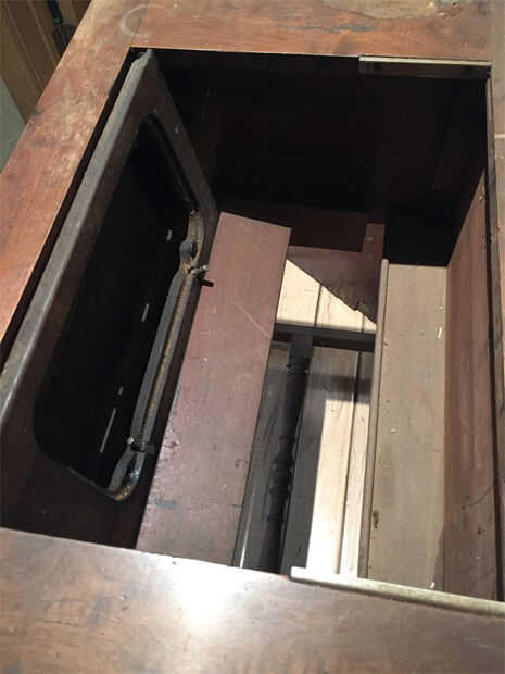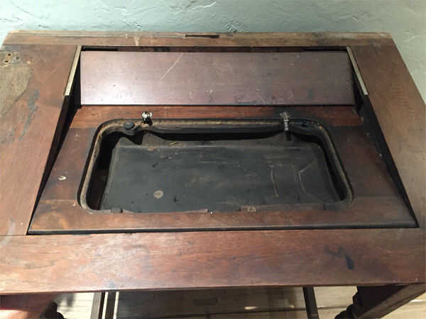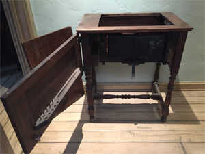 - Un soporte de metal la máquina de coser fue anidado dentro del stand y podría ser levantado para quedar al ras con la superficie del soporte.