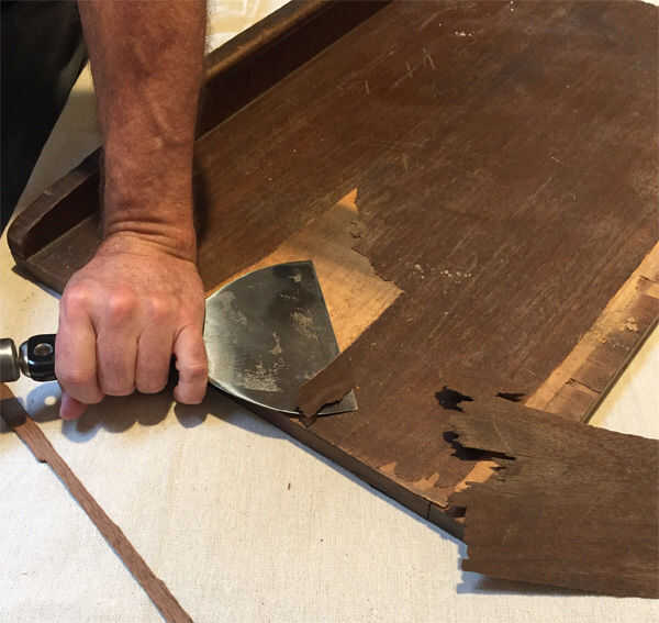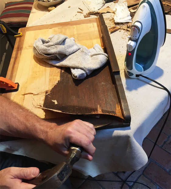 El laminado dañado fue más allá de la reparación, así que tuve que quitar todo. Laminado se pega, así que la humedad caliente ayuda a aflojar. Puse una toalla caliente y húmeda sobre el laminado y utilizado una plancha de vapor para calentar suficientemente para aflojarlo. Luego, inserta un cuchillo grande debajo del borde del laminado y con cuidado quitar el laminado en secciones. Asegúrese de usar una toalla que puede descartar ya que el pegamento se tome la toalla. También, mantenga la lámina de cuchillo tan plano como sea posible para no arañar la superficie de madera. (Si lo hace, puede arena suave o usar relleno de trama para repararlo, como lo hizo mi esposa). Si el laminado no sale cuando empuje (o ligeramente martillo) el cuchillo de masilla, luego humedezca más caliente hasta que el laminado se relaja lo suficiente. Usted puede usar guantes para evitar astillas en las manos y dedos (hablo por experiencia).
