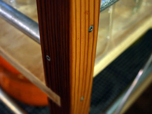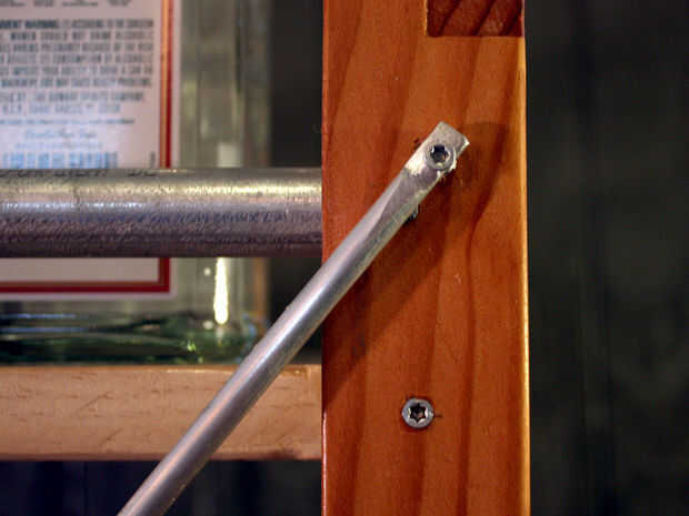 La estructura es muy simple: dos estructuras de paralelo de la escala son puente con tres estantes profundos. Longitudes de conducto eléctrico galvanizado añadir estabilidad lateral y evitar cosas resbalen los estantes. Dos ruedas están emparejadas con un extremo fijo para una buena mezcla de estabilidad y movilidad. En la parte posterior, un elegante aluminio X-brace mantiene todo en línea. Con aproximadamente la mitad del material recuperado, pasé cerca de $50, con la mayor parte de los que van en las ruedas y los titulares de la Copa de vino.